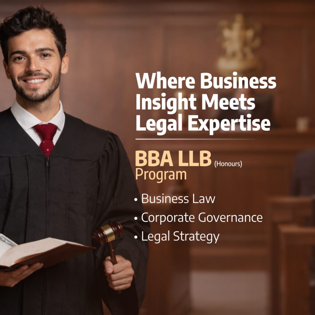 The BBA LLB (Honours) program is a 5-year undergraduate course that integrates legal studies with business and management concepts. The program provides a foundational understanding of corporate law, finance, governance, and entrepreneurship. It also includes practical exposure through moot courts, internships, and legal research activities to enhance real-world understanding. Students develop analytical thinking, negotiation, and decision-making skills, preparing them for careers in corporate law, legal consultancy, litigation, and related professional fields.